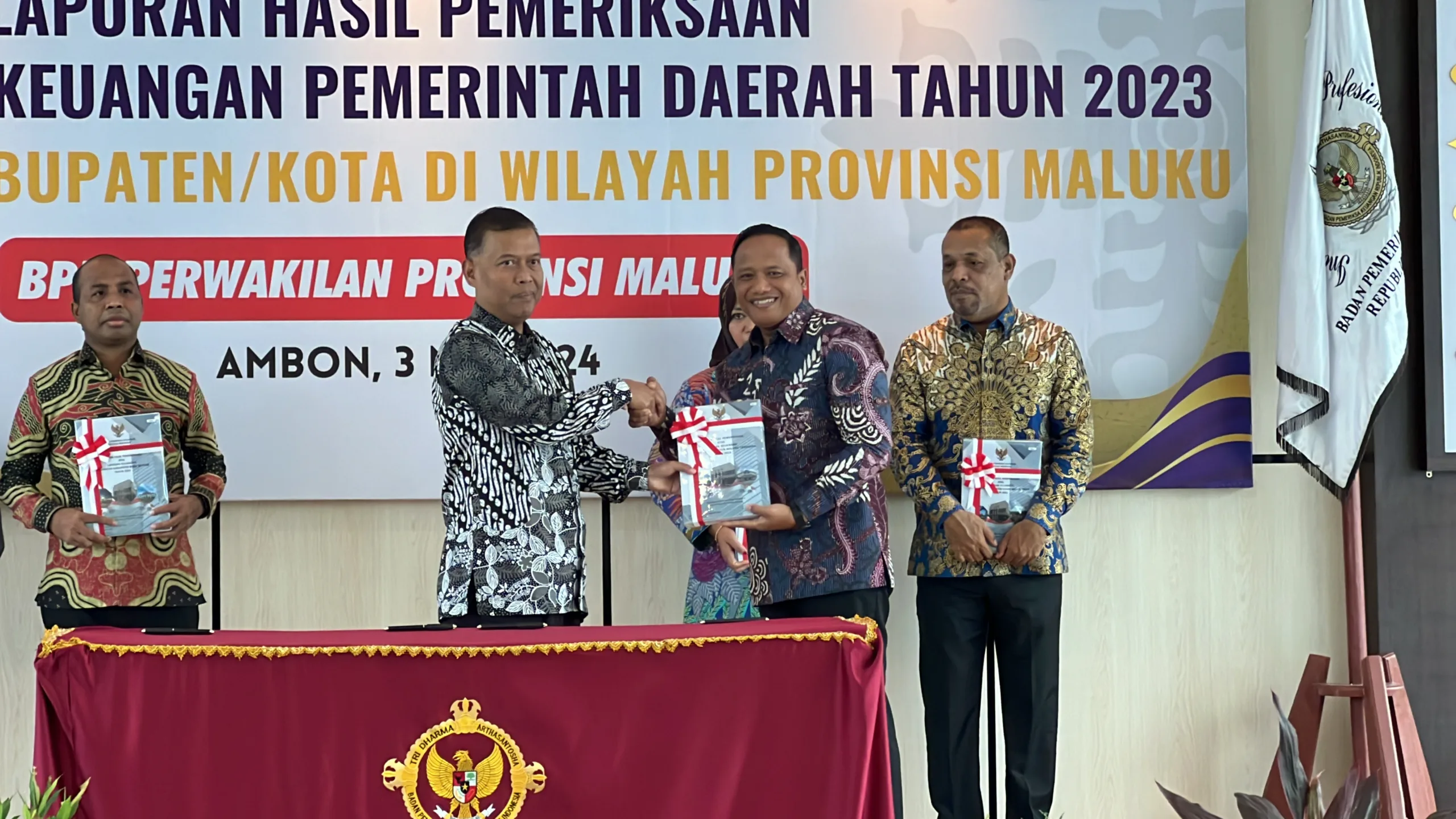 Ambon, SentralNusantara.com – Kepala Badan Pemeriksa Keuangan (BPK) RI Perwakilan Provinsi Maluku, Hery Purwanto, secara resmi menyerahkan Laporan Hasil Pemeriksaan atas Laporan Keuangan Pemerintah Daerah 2023 kepada Kabupaten Buru Selatan, Kabupaten Seram Bagian Timur, dan Kabupaten Maluku Tenggara. Acara penyerahan ini berlangsung di Kantor Perwakilan BPK RI Wilayah Maluku, Kota Ambon.