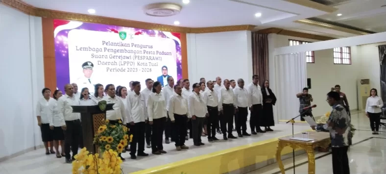 Tual, SentralNusantara.com – Pemerintah Kota Tual menyatakan dukungan penuh kepada Lembaga Pengembangan Pesparawi Daerah (LPPD) untuk meraih juara pada ajang Pesparawi tingkat provinsi yang akan digelar di Masohi. Hal ini disampaikan oleh Pj Walikota Tual, Hi. A. Yani Renuat, S.Sos., M.Si., MH., saat melantik Pengurus LPPD Kota Tual periode 2023-2028 di Aula Kantor Walikota Tual, Kamis (16/5/2024).