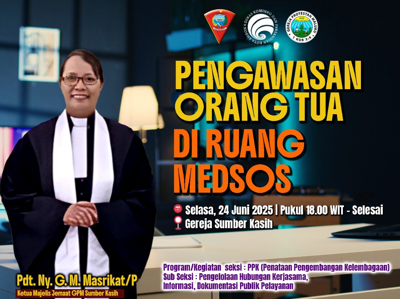 SentralNusantara.com – Ketua Majelis Jemaat GPM Sumber Kasih, Pdt. Ny. G.M. Masrikat/Pea, memberikan apresiasi kepada Pemerintah Kota Ambon melalui Dinas Komunikasi, Informatika dan Persandian (Kominfo) atas penyelenggaraan edukasi bertema “Pengawasan Orang Tua Bagi Anak di Ruang Media Sosial” yang digelar di Jemaat Sumber Kasih, Ambon, Selasa (24/06/2025).