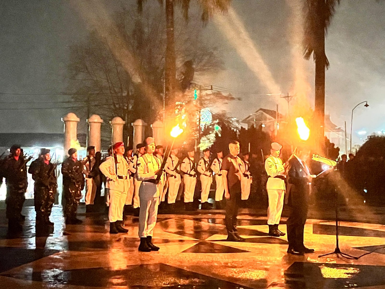 Wakil Gubernur (Wagub) Maluku, Abdullah Vanath, bertindak selaku Inspektur Upacara. Ia hadir bersama Sekretaris Daerah, unsur Forum Koordinasi Pimpinan Daerah (Forkopimda), jajaran pimpinan OPD, serta petinggi TNI dan Polri. Seluruh peserta tampak mengenakan pakaian dinas upacara lengkap, berdiri dalam barisan rapi meski diguyur hujan malam yang tak kunjung reda.